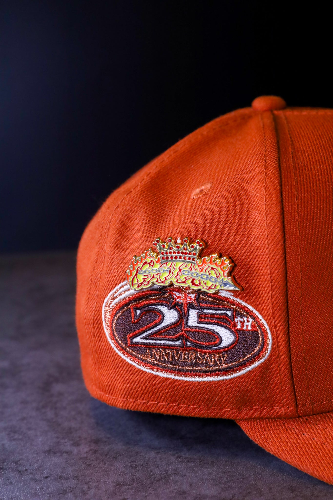 Gold base, red glitter, glow in the dark hat pin.
